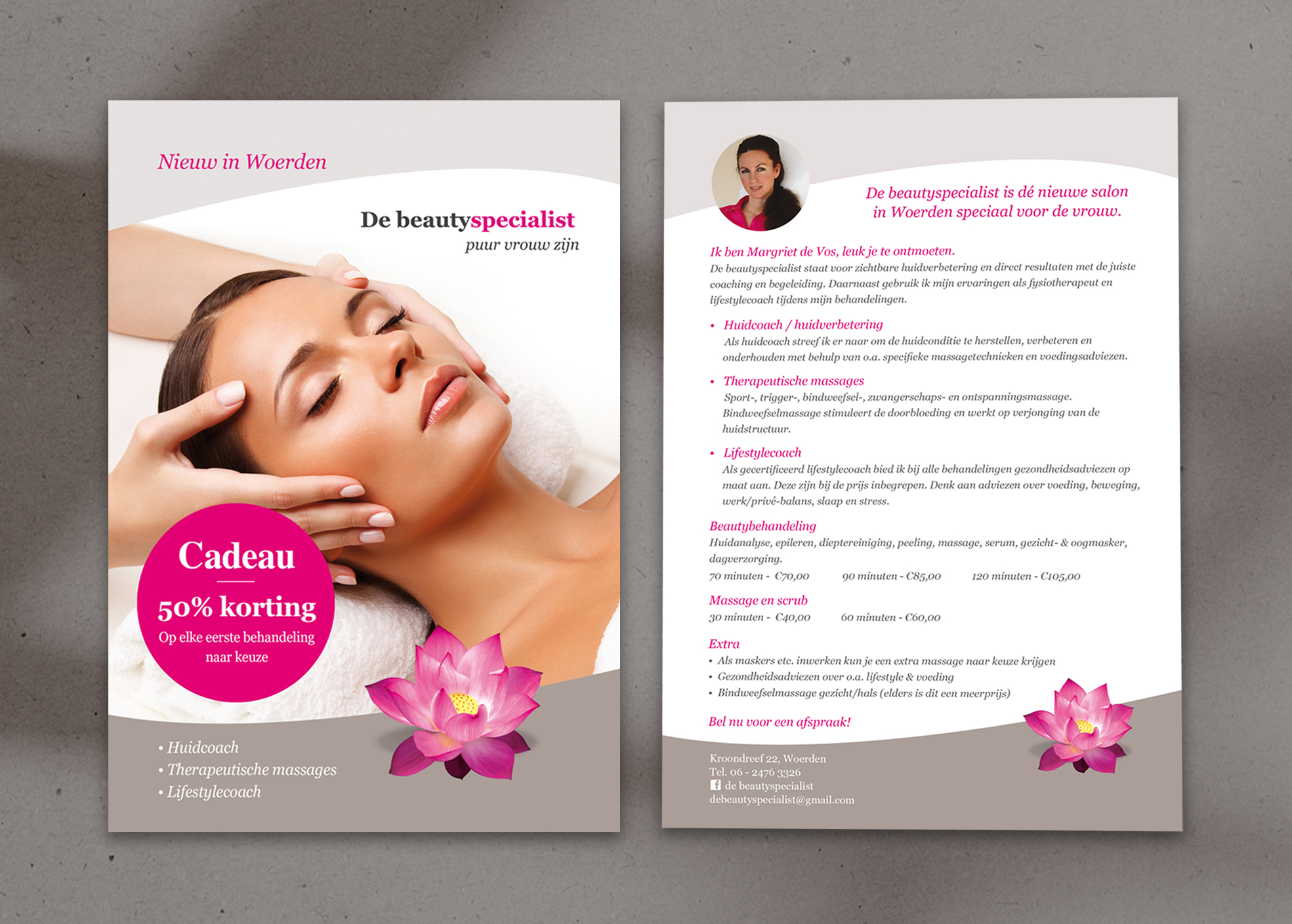 Voor De Beautyspecialist ontwierp ik een flyer waarmee het bedrijf zich op meerdere locaties laagdrempelig presenteerde.